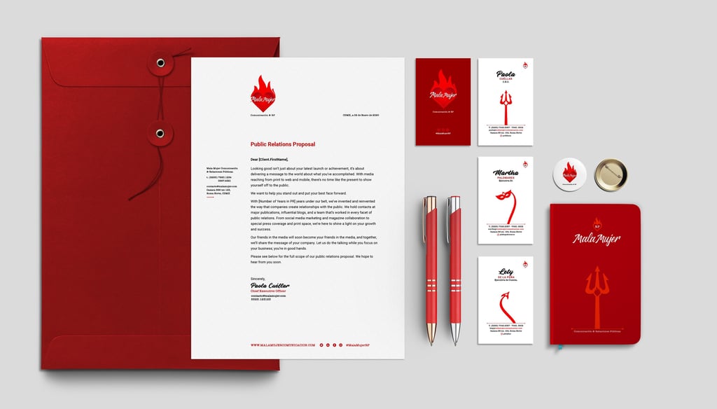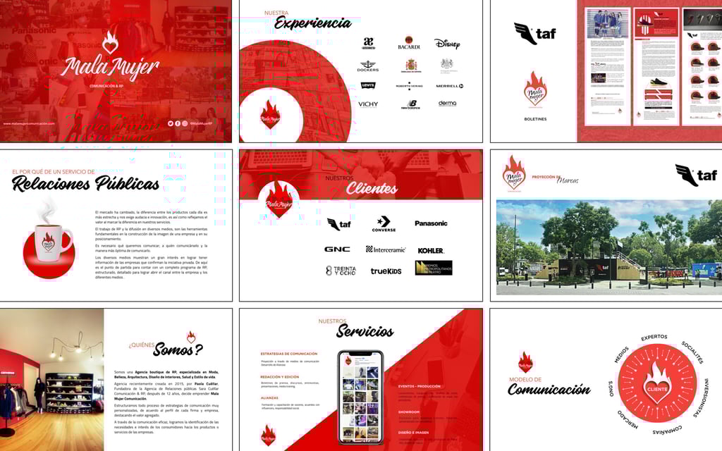 L’identité a été déployée sur l’ensemble des supports stratégiques de l’agence : branding global, papeterie, site web, présentations PowerPoint, newsletters, supports digitaux et merchandising. Le résultat est une image de marque cohérente, distinctive et résolument contemporaine, pensée pour positionner Mala Mujer comme une agence de communication audacieuse, influente et tournée vers de nouvelles manières de connecter les marques aux médias.